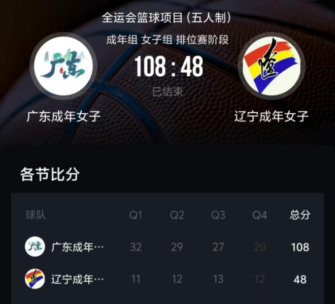 全运会女篮半决赛,广东队以108-48大胜辽宁队60分,虽然都是进入四强的球队,但是各支球队之间的实力差距还是很大的。女篮总决赛的比赛将在广东队和四川队之间展开,时间是11月15日晚上19:30,地点在佛山顺德德胜体育馆。广东女篮和四川女篮的实力都很强,两支球队都有多名国家队成员,半决赛四川队以107-65大胜江苏队,同样展现出了不俗的实力。